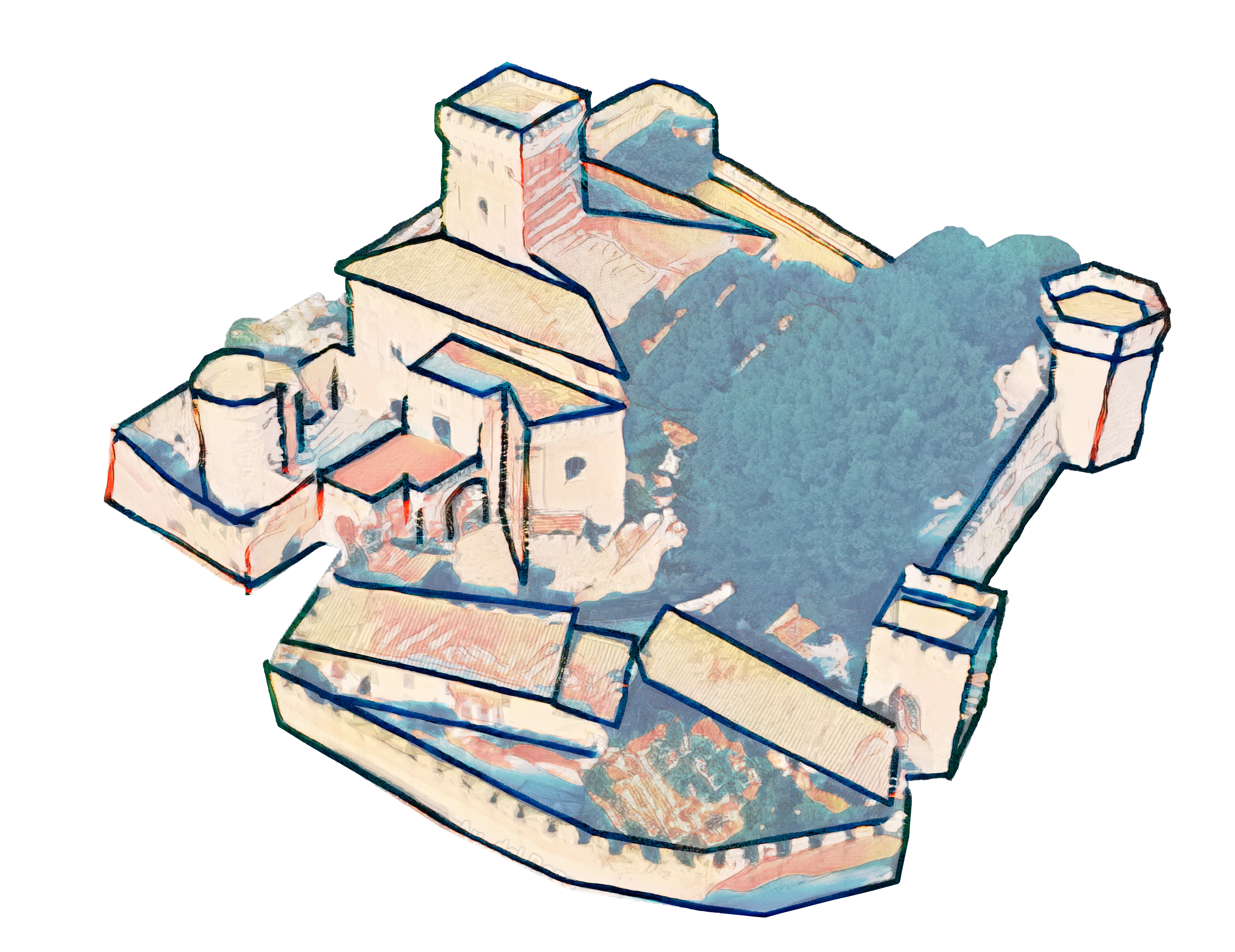 Desde el patio de armas, una puerta situada al frente permite el acceso a una galería en forma de L, que son las antiguas caballerizas del castillo. Antiguamente estas dependencias debían de haber tenido un falso techo que permitía la división horizontal de la estancia y por lo tanto una nueva estancia sobre las caballerizas, aunque desconocemos el uso que tenía este piso superior. En las caballerizas se han encontrado toda una serie de dibujos o grafitis en los muros con la más diversa temática: barcos, círculos, dibujos superpuestos, planta de una iglesia y otras formas de difícil interpretación. De todos modos no está claro que estas salas hayan sido siempre caballerizas, pueden haber servido como cuerpo de guardia, establos o alguna otra utilidad que desconocemos.